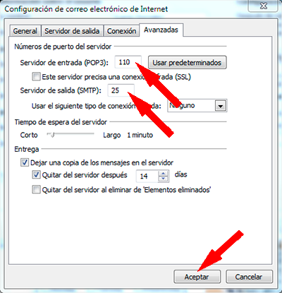 Aquí se nos abre una ventana con cuatro pestañas, seleccionaremos la segunda "Servidor de salida" y señalaremos como activadas, las casillas "Mi servidor de salida (SMTP) requiere autenticación" y "Utilizar la misma configuración que mi servidor de correo de entrada". Seguidamente seleccionamos la pestaña "Avanzadas" y comprobamos que los puertos de entrada y salida coinciden con los proporcionados por nuestro administrador de correo, estos pueden variar si se trata de una conexión cifrada (SSL), o no. Seguidamente pulsamos el botón "Aceptar para regresar a la ventana de configuración.