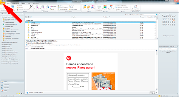 Por supuestto a vosotros se os abrira sin cuentas ni mensajes recibidos y seguramente con las ventanas una al lado de la otra y no una encima de otra, pero eso son, configuraciones personalizadas que podreis cambiar vosotros mismos. Vamos pues a configurar nuestra cuenta de correo. Para ello clicaremos en la pestaña "Archivo".