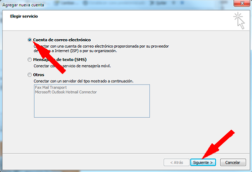 Y tras hacer esto aparecerá otra ventana con tres opciones, seleccionamos la primera "Cuenta de correo electrónico" y hacemos clic en "Siguiente".