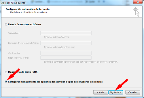 En la siguiente ventana seleccionaremos la opción "Configurar manualmente las opciones del servidor o tipos de servidores adicionales" y haremos clic en "Siguiente". Ya que la configuración automática de los correos, pocas veces funciona.