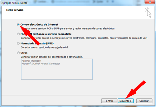 En esta ventana elegiremos la opción "Correo electrónico de Internet" y clic en "Siguiente".