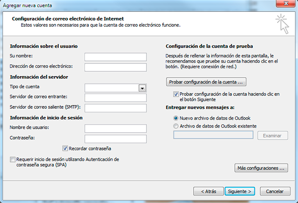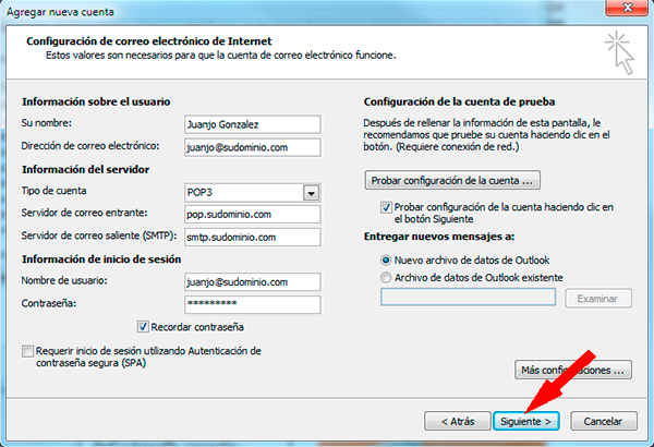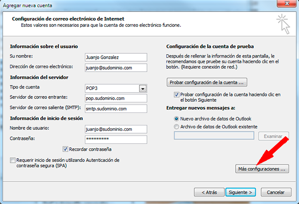 Correo POP3 Solo comentar que la casilla donde nos pide "Su nombre:", no es un nombre proporcionado por el administrador, sino el nombre que nosotros elijamos para describir esta cuenta (Ejemplo: Nombre y Apellidos o Cuenta del trabajo. etc.). Rellenaremos uno a uno, todos los datos que nos pide, de la manera que se ha explicado al principio de esta pagina. Pulsando a continuación en el botón "Mas configuraciones".