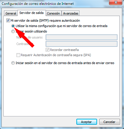 Aquí se nos abre una ventana con cuatro pestañas, seleccionaremos la segunda "Servidor de salida" y señalaremos como activadas, las casillas "Mi servidor de salida (SMTP) requiere autenticación" y "Utilizar la misma configuración que mi servidor de correo de entrada". Seguidamente seleccionamos la pestaña "Avanzadas" y comprobamos que los puertos de entrada y salida coinciden con los proporcionados por nuestro administrador de correo, estos pueden variar si se trata de una conexión cifrada (SSL), o no. Seguidamente pulsamos el botón "Aceptar para regresar a la ventana de configuración.