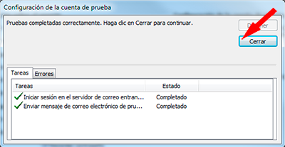 Y se nos abrirá una ventana, en la que se chequeara la configuración de los servidores de entrada y salida y si todo ha ido bien, nos marcara con dos símbolos de verificación en verde que todo es correcto. Tras esto pulsamos en "Cerrar".