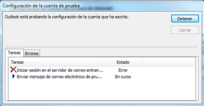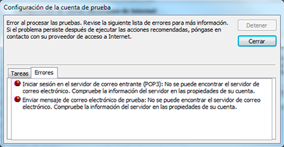Por el contrario, si algo a fallado en nuestra configuración, tanto en el servidor entrante como en saliente, nos lo marcara con un aspa roja y nos informara que existe un error en nuestra configuración de servidores. Tras lo que tendremos que repasar toda nuestra configuración en busca de algún fallo.